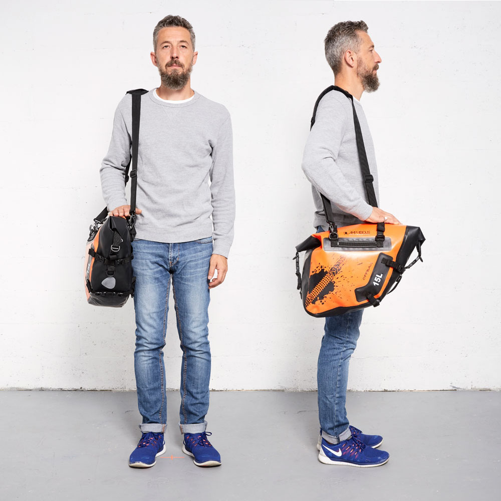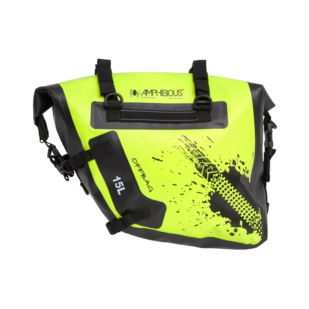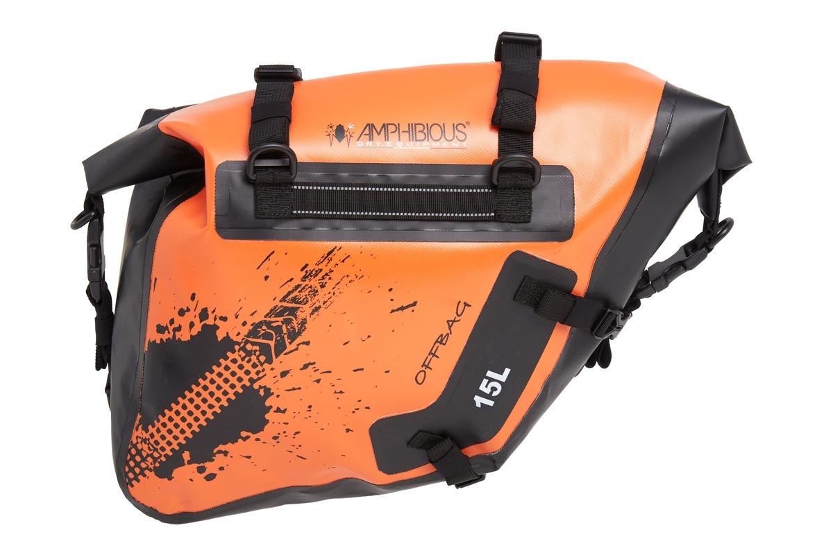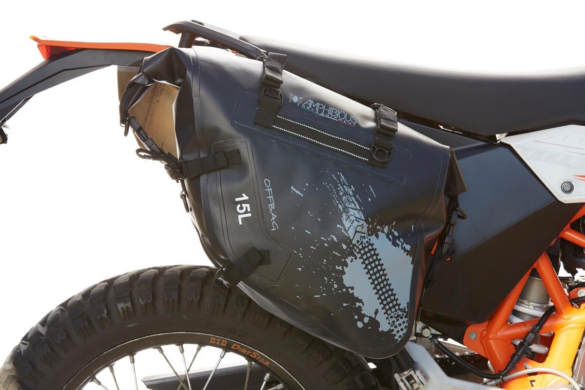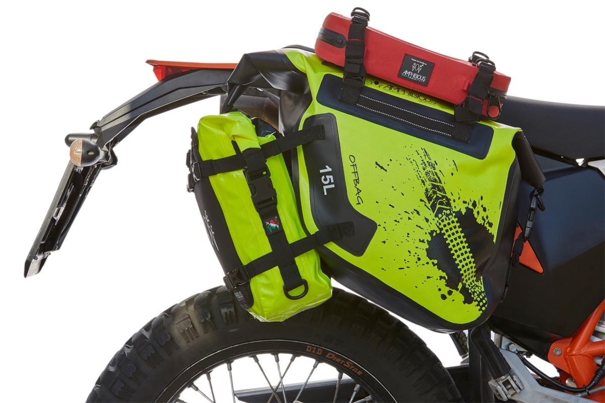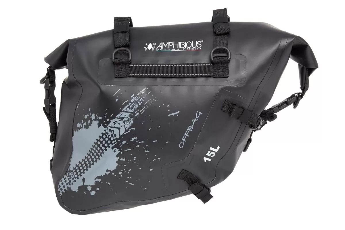 La Alforja Offbag de Amphibious es una bolsa lateral compacta diseñada para motos Enduro, Supermoto, Naked, On-off road y scooters urbanos. Fabricada en resistente PVC HD++ 1000 D y material reforzado anti calor, ofrece durabilidad y protección incluso en condiciones extremas y tras caídas. Con capacidad ajustable hasta 15 litros, es ideal para transportar objetos de manera segura y práctica sin necesidad de estructuras adicionales para su fijación.