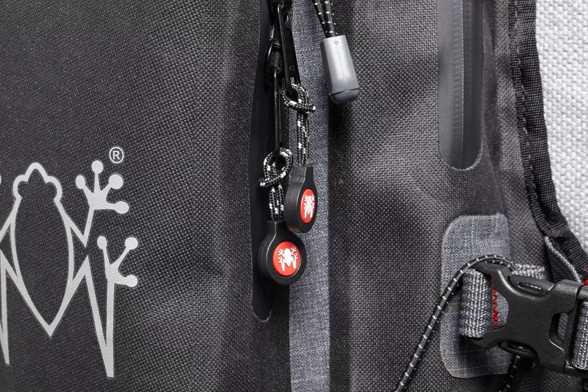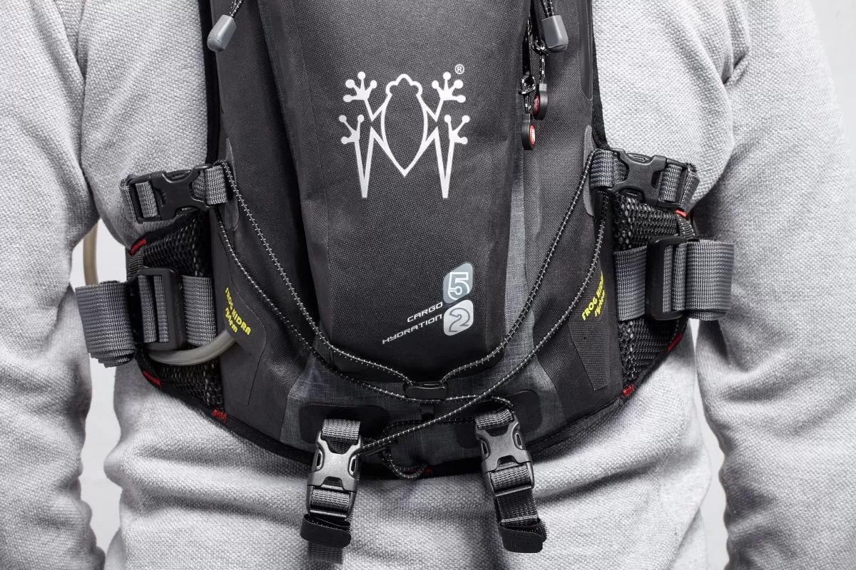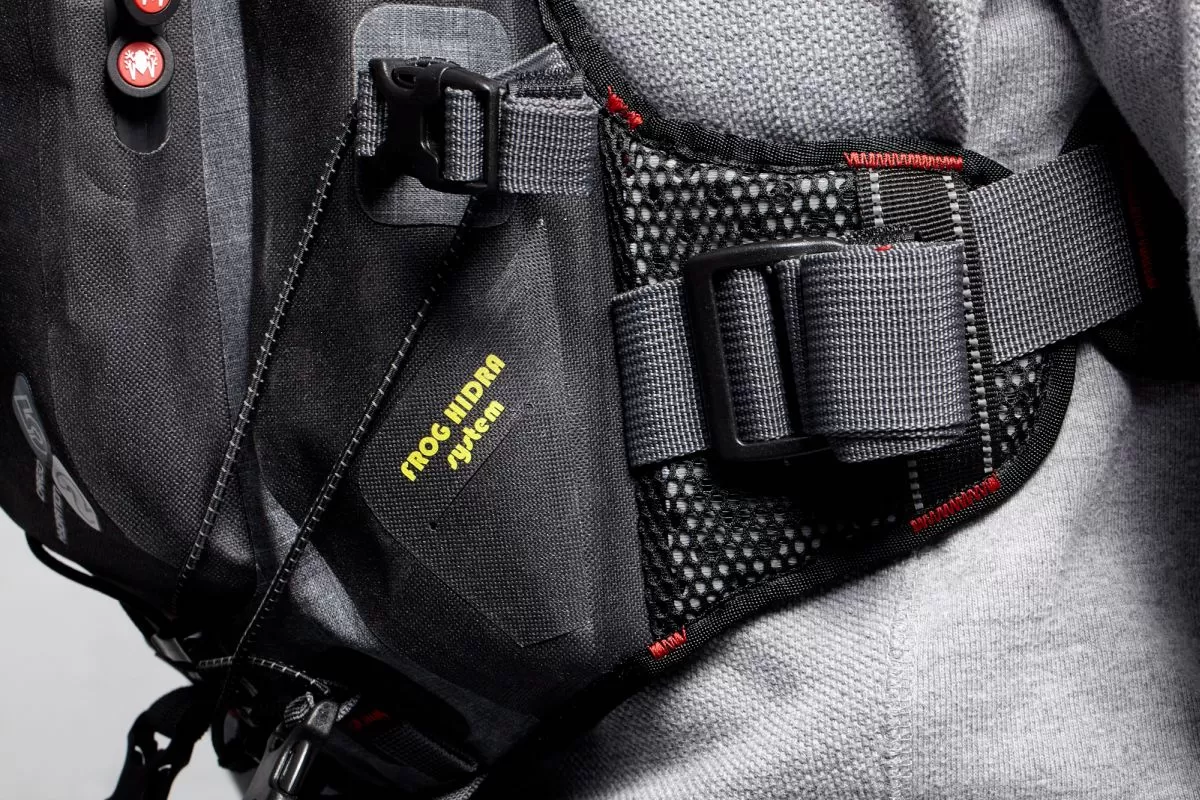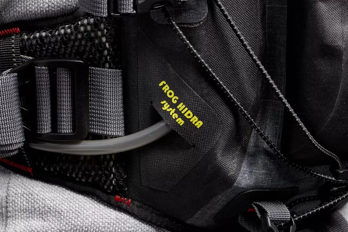 - Sistema Frog Hidra para dos sacos de hidratación simultáneos (hasta 2 litros cada uno), con tuberías posicionables y fijación regulable