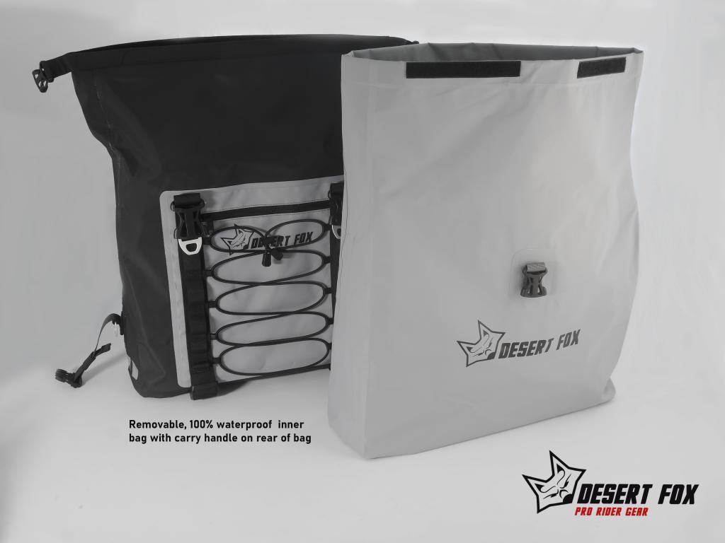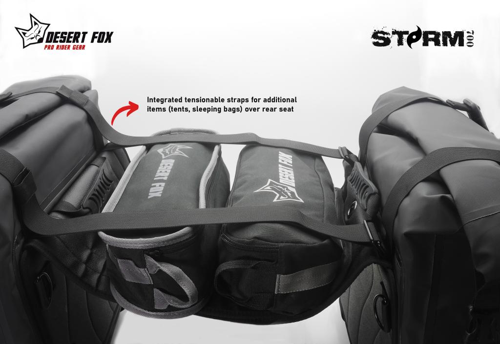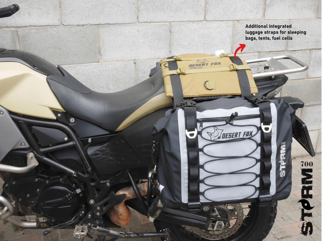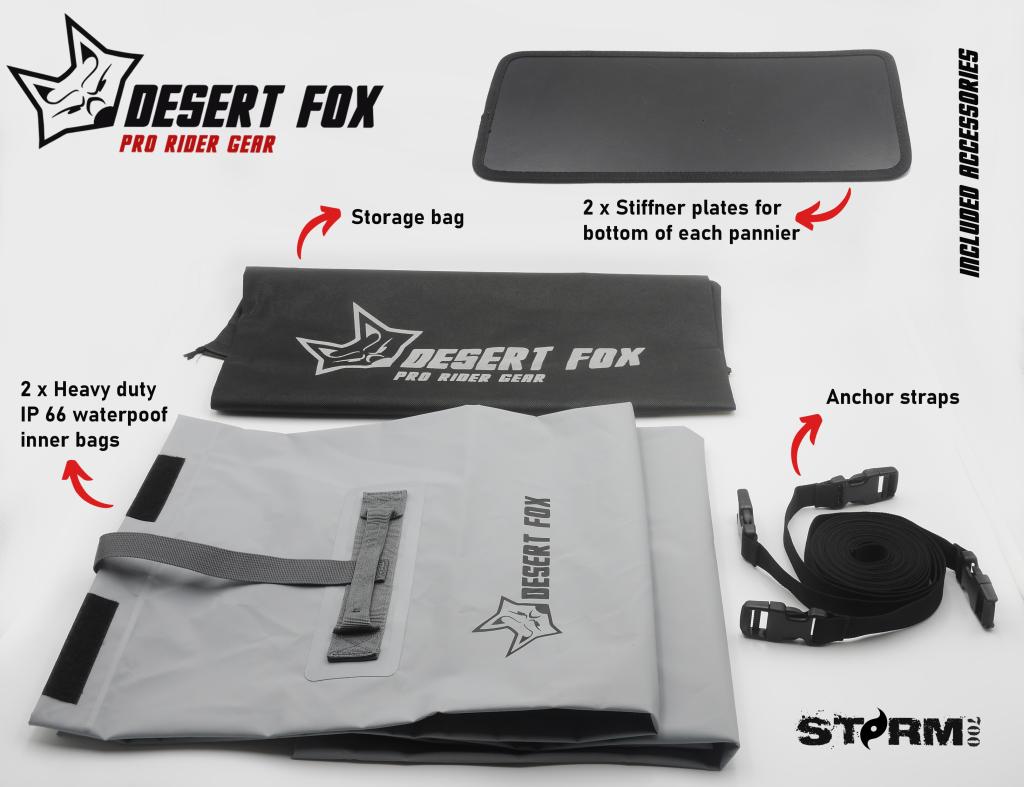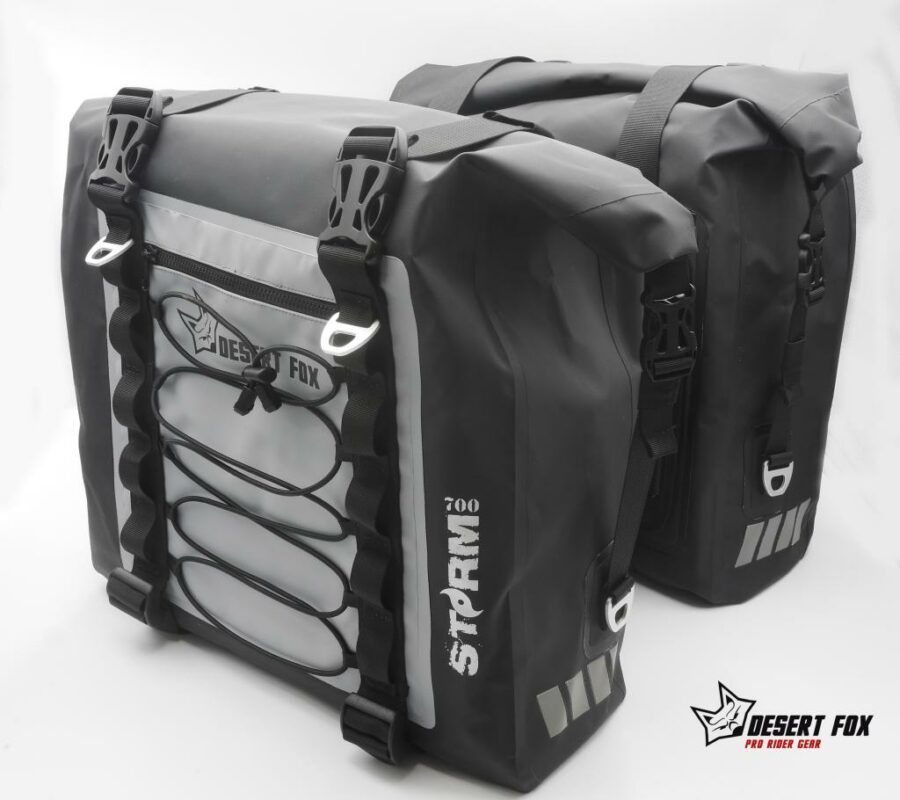 Las alforjas Desert Fox Storm 700 son bolsas de equipaje para moto diseñadas para proteger tu equipo en condiciones extremas. Fabricadas con poliéster tarpaulín impermeable de 4 capas, ofrecen resistencia total al agua, polvo y barro, ideales para aventuras off-road. Su diseño práctico y robusto garantiza que tu ropa y equipo se mantengan secos y seguros en todo momento.