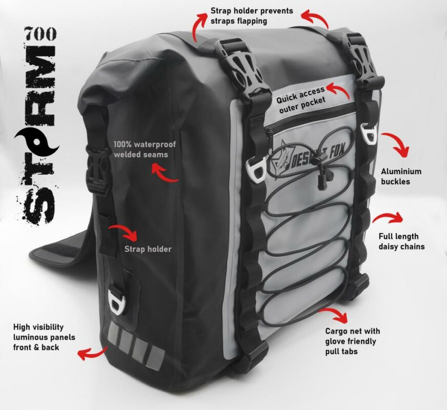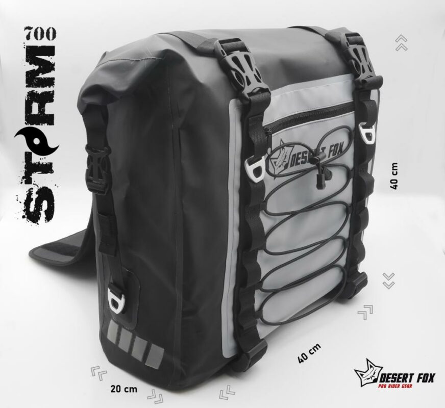 Lo que hace única a la Desert Fox Storm 700 es su construcción avanzada con costuras selladas por radiofrecuencia que impiden filtraciones de agua, y aluminio aeronáutico en hebillas para máxima durabilidad. Además, sus bolsas interiores removibles y el sistema de sujeción adaptable proporcionan comodidad y seguridad insuperables para cualquier motociclista aventurero.