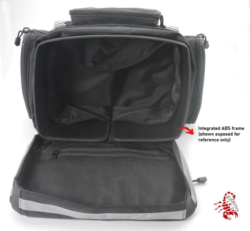 KAROO destaca por su construcción robusta con materiales de alta calidad como el nylon balístico y herrajes de aluminio, garantizando resistencia y seguridad. Su bolsa interior impermeable y extraíble elimina la necesidad de una cubierta para lluvia, mientras que su sistema de montaje rápido sin herramientas y su capacidad expandible de 22 a 30 litros lo convierten en el bolso perfecto para motociclistas que desean funcionalidad sin complicaciones.