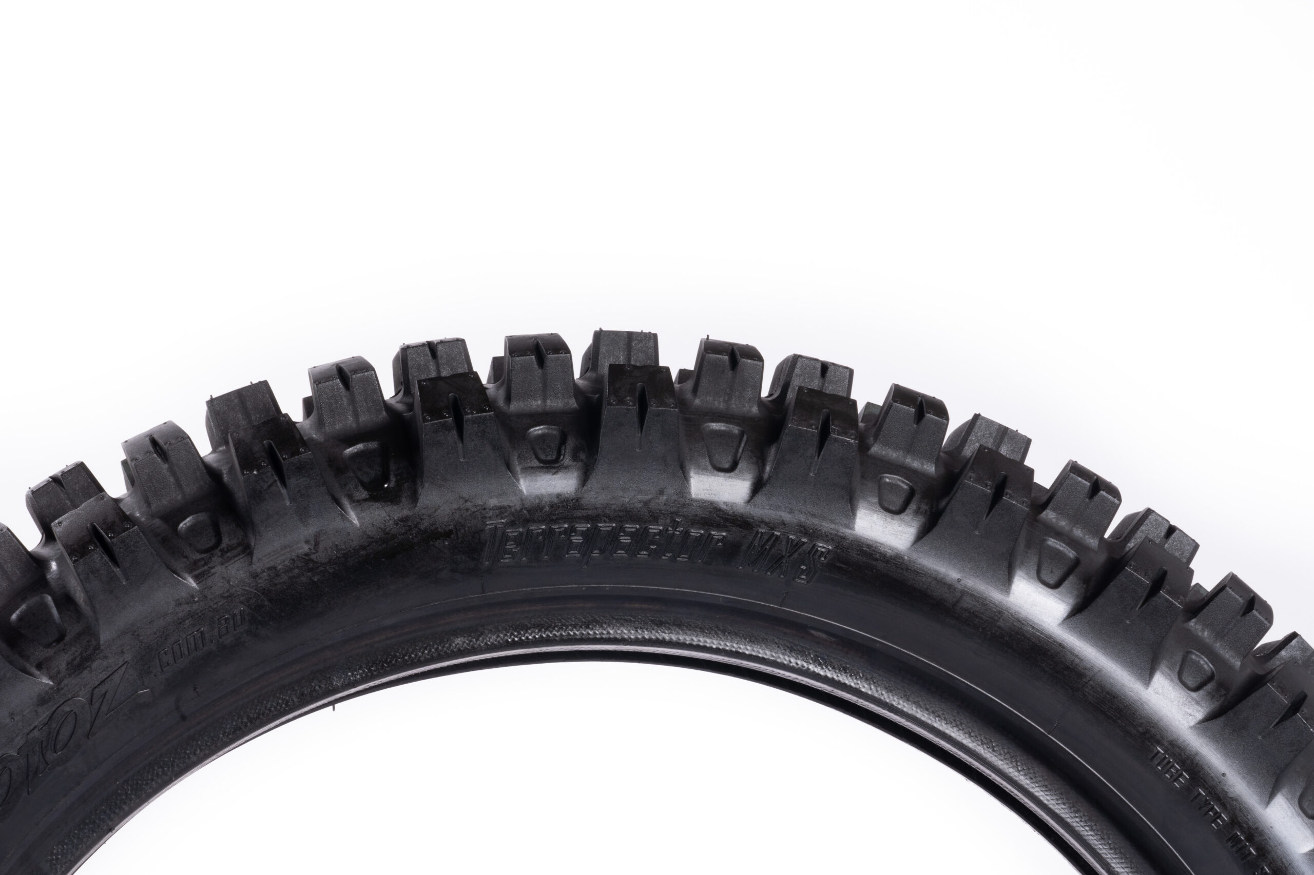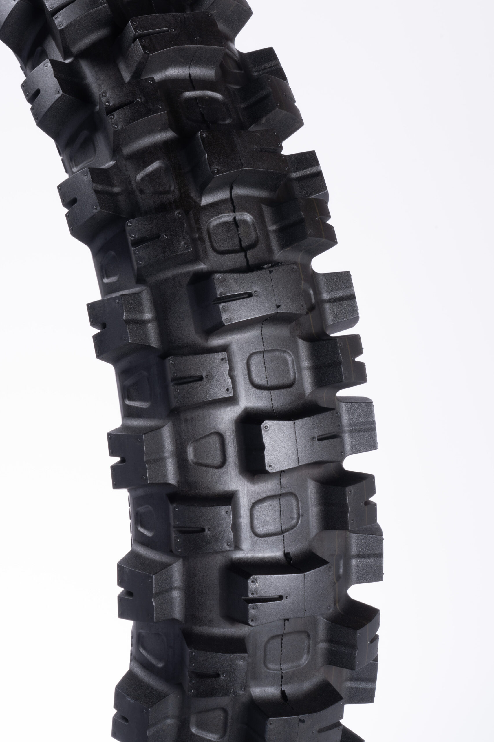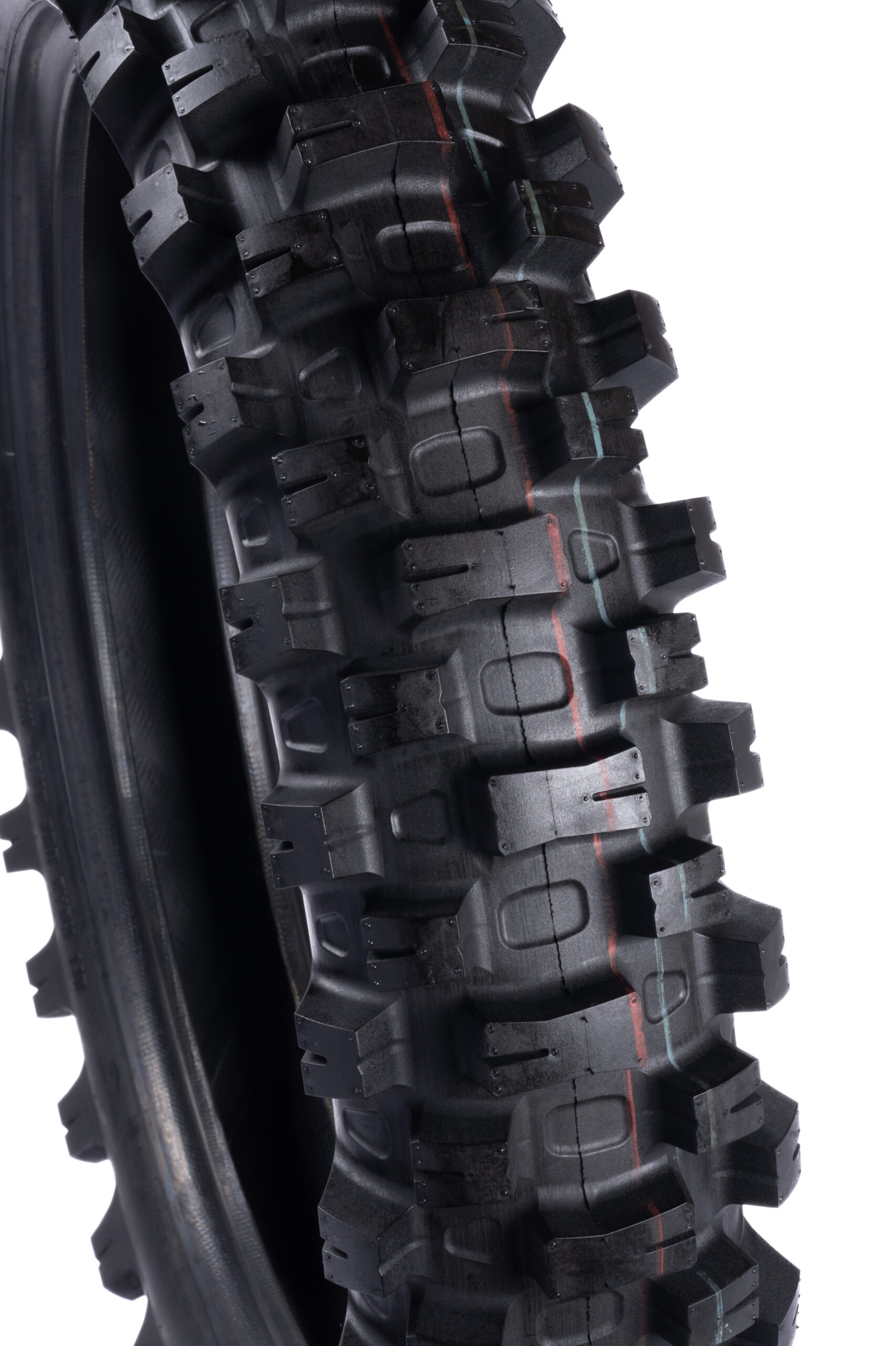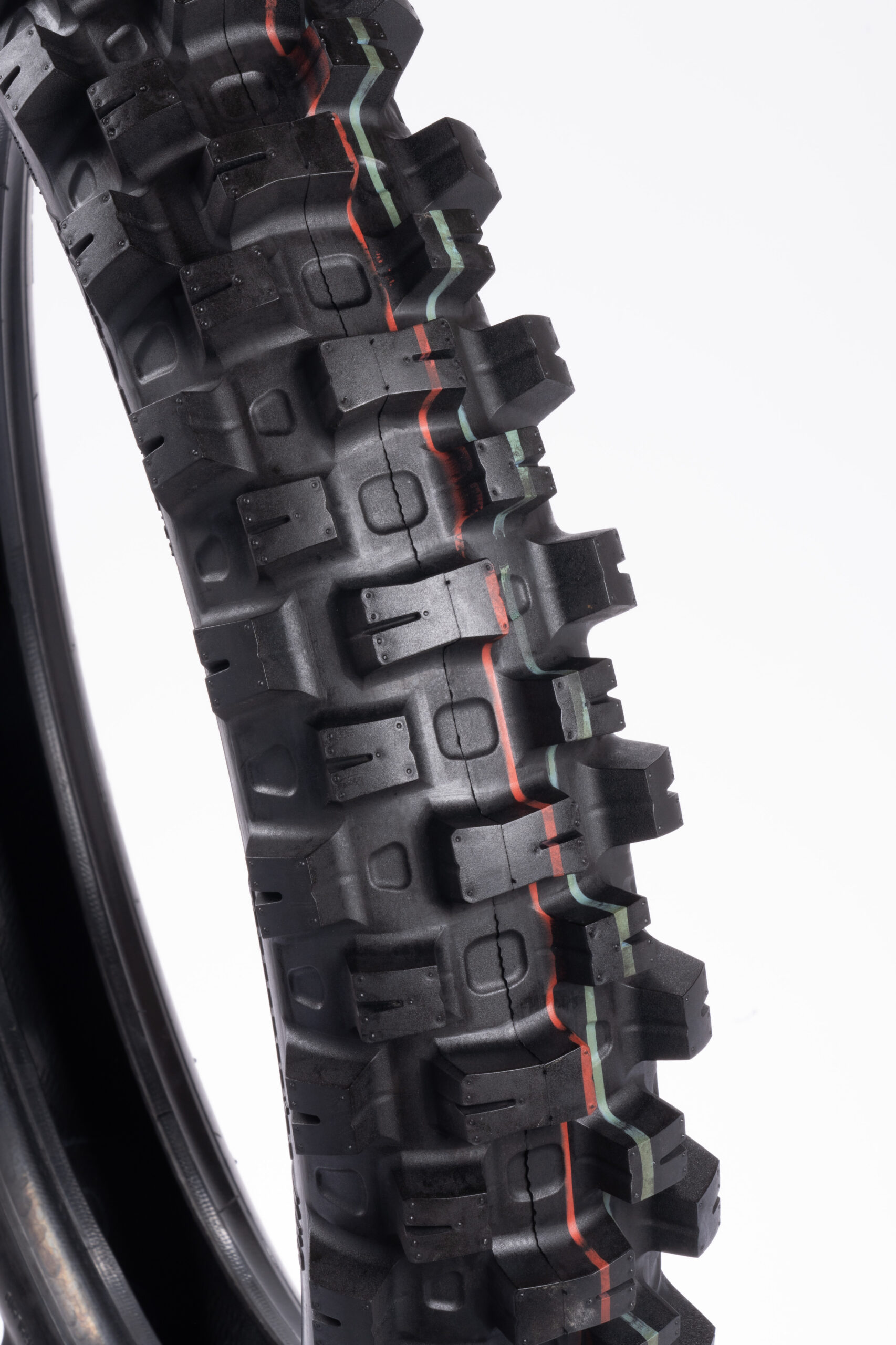 Este neumático se destaca por incorporar zonas flexibles en la carcasa y en cada fila de la banda de rodadura, mejorando la tracción en curvas y la estabilidad durante la aceleración. Además, su compuesto MX de última generación aumenta la durabilidad, ofreciendo un rendimiento superior y confianza en terrenos blandos.