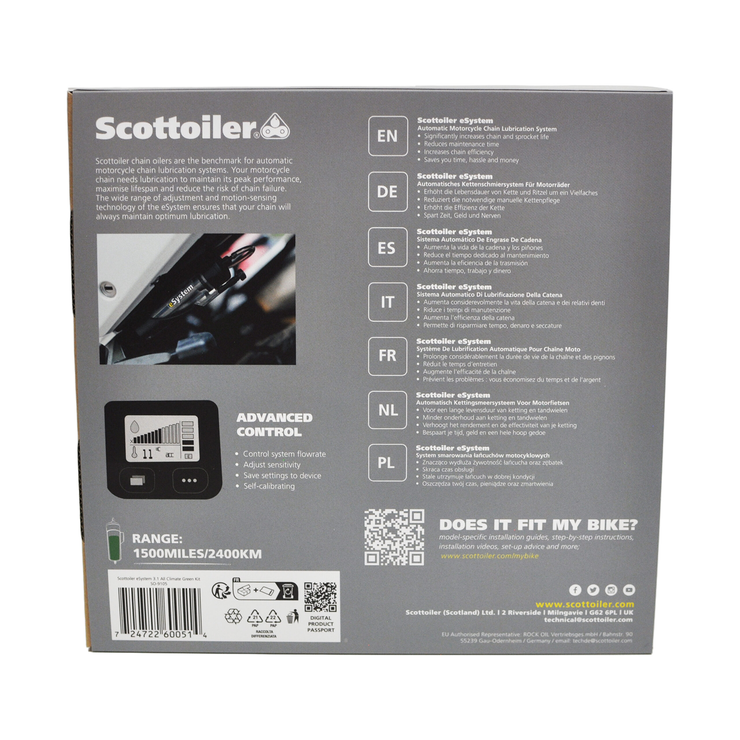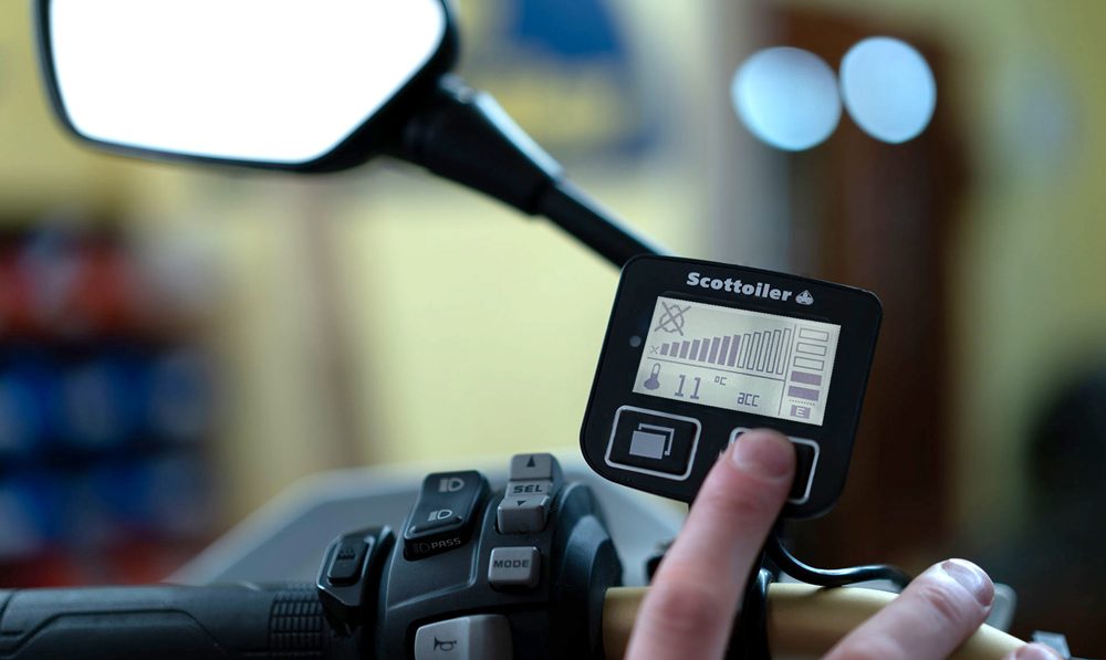 El Scottoiler eSystem 3.1 es un sistema electrónico automático de lubricación de cadena para motocicletas que ofrece control total y facilidad de uso. Equipado con una pantalla montada en el manillar, permite ajustar la tasa de flujo, verificar el nivel de aceite y modificar la sensibilidad en tiempo real, facilitando el mantenimiento continuo de la cadena y reduciendo el desgaste de la transmisión sin intervención manual. Su instalación es sencilla, con conexión directa a la batería o mediante una línea conmutable.